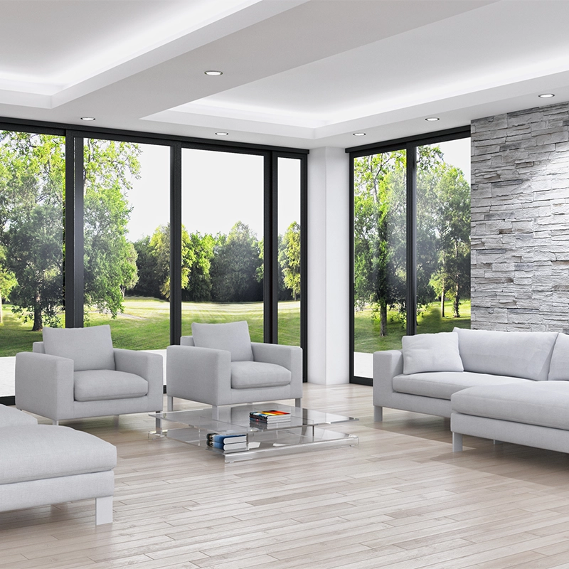 Wohnzimmer mit Sofasesseln vor großen Fenstern